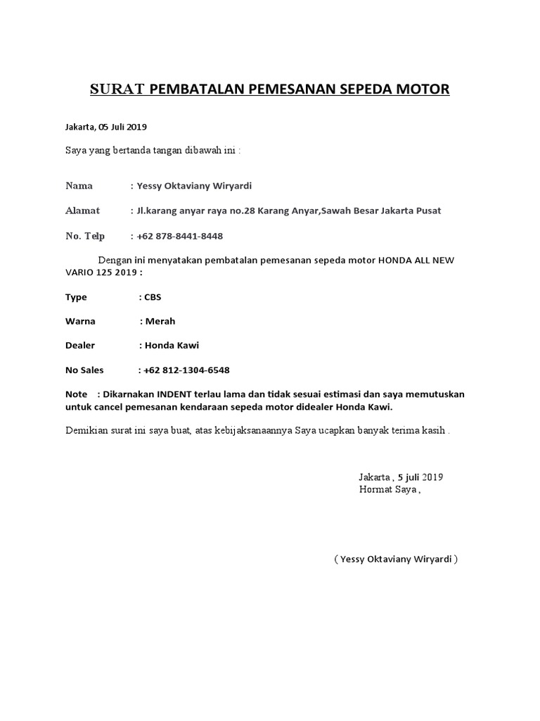 Contoh Surat Pembatalan Pemesanan Pdf