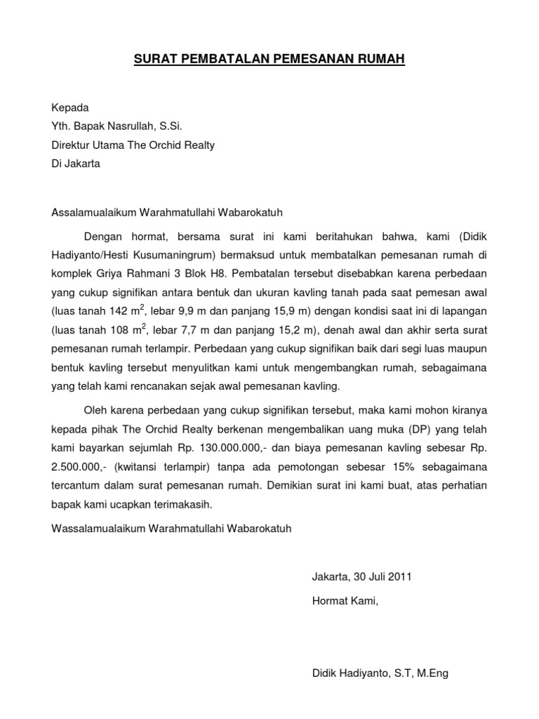 Surat Pembatalan Pemesanan Rumah Pdf