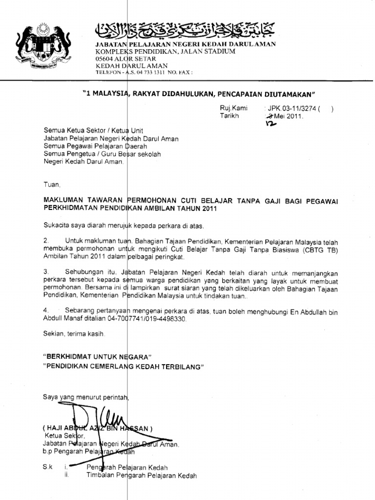 Surat Makluman Tawaran Cuti Belajar Tanpa Gaji Pdf