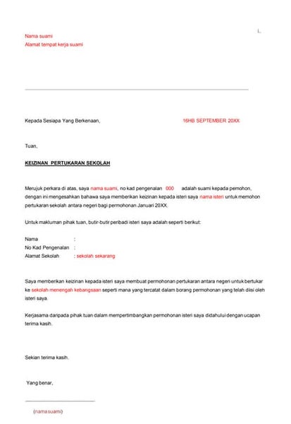 L Nama suami Alamat tempat kerja suami Kepada Sesiapa Yang Berkenaan Tuan KEIZINAN PERTUKARAN SEKOLAH 16HB SEPTEMBER. Dan anda perlukan sedikit rujukan agar. Contoh surat izin suami e.